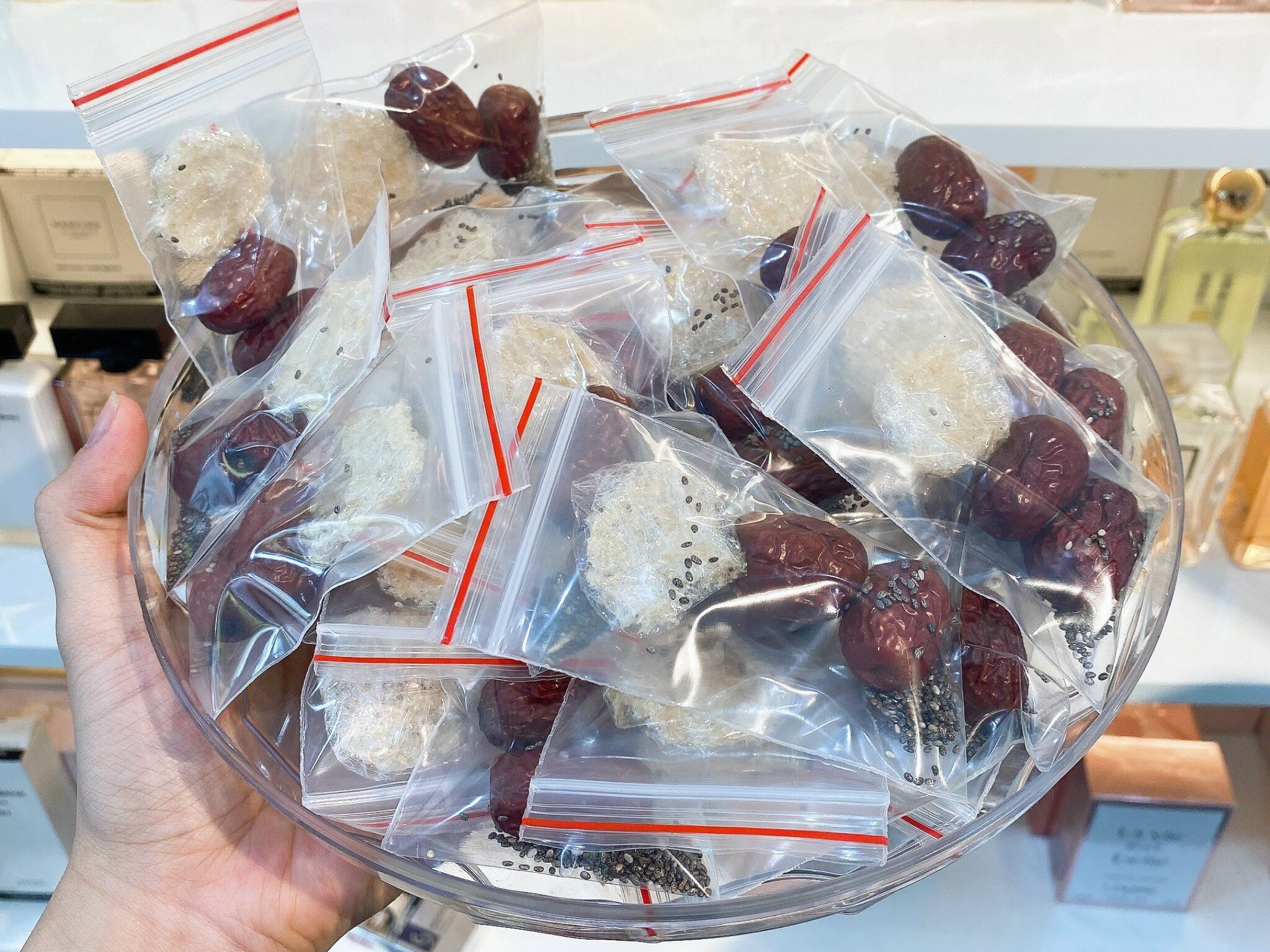 Kèm nguyên liệu chưng sẵn: táo đỏ, hạt chia, đường phèn
